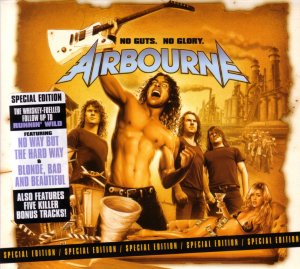 Airbourne – No Guts. No Glory. Ein Artikel in einer Musikzeitschrift hatte mich auf die australische Band Airbourne aufmerksam gemacht. Die mir bis dato unbekannte Gruppe wurde unter anderem als legitime Nachfolger von Rose Tattoo und AC/DC bezeichnet. Das machte mich neugierig und so schlug ich in einem Elektromarkt zu, der das Album „No Guts. No Glory.“ gar zu einem Sonderpreis in einer limitierten Auflage mit aufblasbarer Plastikgitarre (im wahrsten Sinne des Wortes eine Luftgitarre) anbot. |