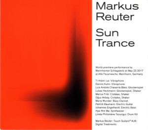 Sun Trance Die 104. Veröffentlichung des US-Amerikanischen MoonJune Records-Labels stellt eine Aufnahme des deutschen Touch Gitarristen Markus Reuter dar, die bei einem Liveauftritt in der Alte Feuerwache in Mannheim am 23.05.2017 mitgeschnitten wurde. Unterstützt wurde Markus Reuter bei seinem Auftritt von einem elfköpfigen Ensemble des Mannheimer Schlagwerk. Dieses ist das Schlagzeug- und Percussion-Ensemble der Staatlichen Hochschule für Musik und Darstellende Kunst Mannheim. |