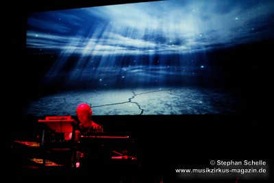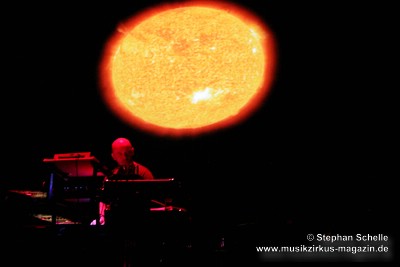Los ging es mit dröhnenden Synthiesounds die von herrlichen Flächen und Effekten ergänzt wurden. Zu diesen ersten Klängen zogen zunächst graue Wolken auf dunklem Untergrund, dann Wolkenformation am blauen Himmel auf der Leinwand dahin. Sobald die Klangfarben sich erhellten, wurden auch die Wolken freundlicher. Paul malte in diesen ersten Momenten eine düstere Stimmung, die sich aber nach gut drei Minuten veränderte, in dem nun Arpeggios aufkamen und sich langsam Harmonien entwickelten, die sich anhörten, als hätten Tangerine Dream und Jean-Michel Jarre in den 70’er bzw. 80’er Jahre dieses Stück zusammen eingespielt. Immer treibender wurde die Musik in die nun auch Mellotronklänge eingebaut wurden, während nun unser Globus und Sonnensysteme auf der Leinwand zu sehen waren. Ab jetzt war man von Paul’s Musik absolut gefesselt.