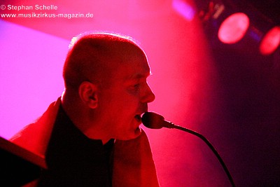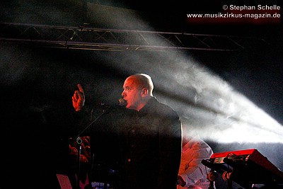 Bühnenmitte um entweder einen durch Computer verzerrten Gesang
