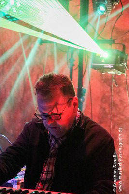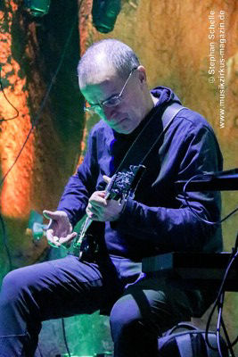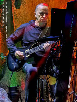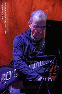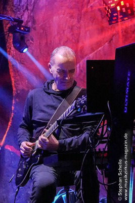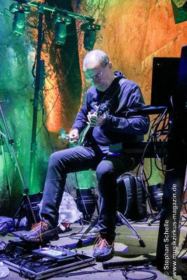 Während Axel Stupplich seine Keyboards bediente, spielte Max Schiefele die meiste Zeit E-Gitarre inkl. zahlreicher Effekte sowie teilweise Keyboard. Max agierte – bis auf die letzte Zugabe – recht zurückhaltend und sphärisch an seiner E-Gitarre. Dabei setzte er ein ums andere Mal auch den E-Bow ein. Das ist ein handliches Kunststoffgehäuse, in dem ein Magnetfeld die Saiten der Gitarre zum Schwingen bringt. Dadurch entsteht ein lang anhaltender, gleichmäßiger Ton, was perfekt zu den elektronischen Klängen der Beiden passte.