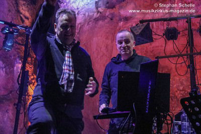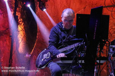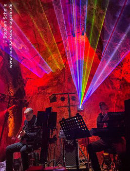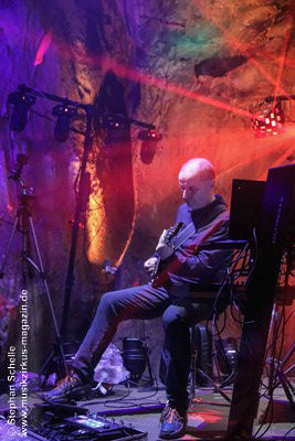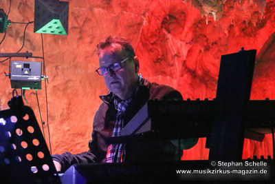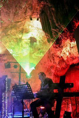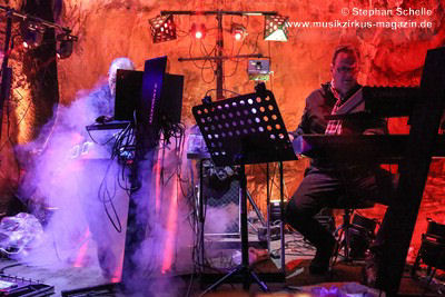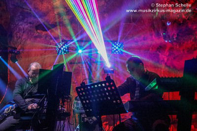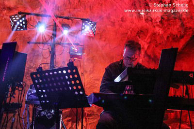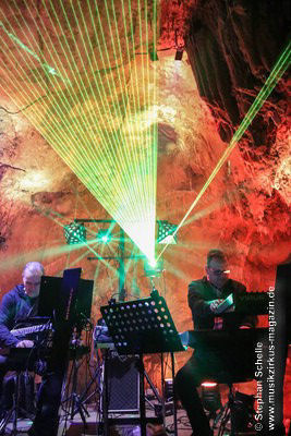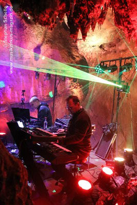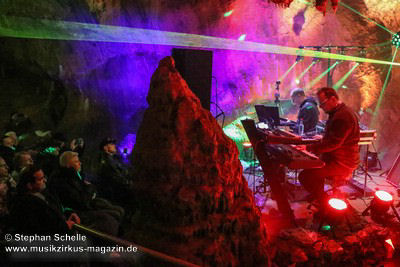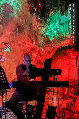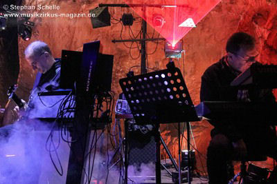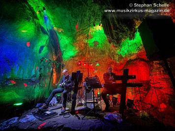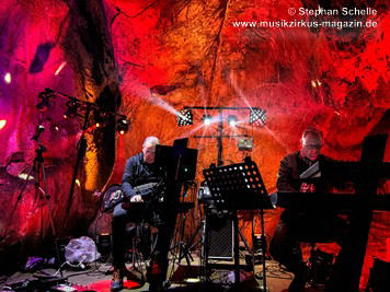 Nahtlos schloss sich dann „Out In The Cold“ an, das die Beiden zusammen in einer Session in der Rhön aufgenommen haben. Sie hatten sich vor gut drei Jahren ein Haus in der Rhön gemietet und dort ihre Instrumente aufgebaut. Nachdem sie zunächst durch den tiefen Schnee gewandert waren, hatten sie sich dann nachmittags an ihre Geräte gesetzt und losgejammt. Dabei sind einige Stücke entstanden, die sie als Sonic Transients unter dem Titel „The Rhoentapes“ bei Bandcamp veröffentlicht haben. „Out In The Cold“ war sehr atmosphärisches Stück mit sanftem Rhythmus, das zum Träumen anregte. Und nahtlos ging es dann auch gleich mit dem unveröffentlichten Track „Nightglow“ weiter, bei dem die Klänge förmlich durch die Kanzelgrotte schwebten.
