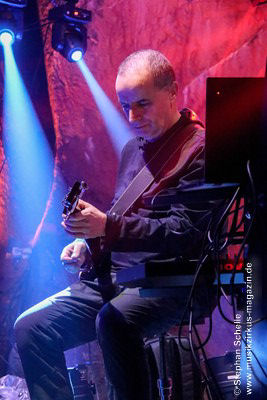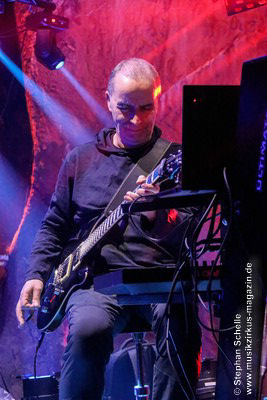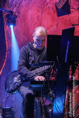 Nach diesem ruhigen Stück kam dann eine druckvolle Version des Pyramid Peak-Stücks „Flowing With Birds“ an die Reihe. Wie Axel erklärte, hatte Max die CD „Caveland“ in die Hände bekommen und das Stück „umgebastelt“. Das gefiel ihnen so gut, dass sie es unbedingt live spielen wollten. Max hat dieses Stück (in der Liveversion fast doppelt so lang) mit herrlichen Gitarrenparts bzw. -soli versehen und es so auf eine neue Ebene gehoben. Hier traf atmosphärischer Rock auf elektronische Musik. Diese Version war eines der Highlights des Konzertes.