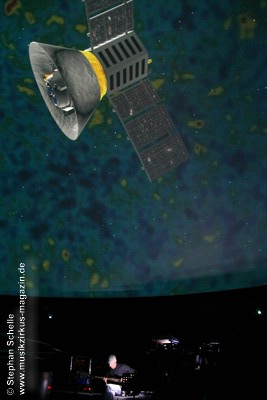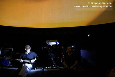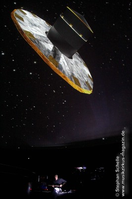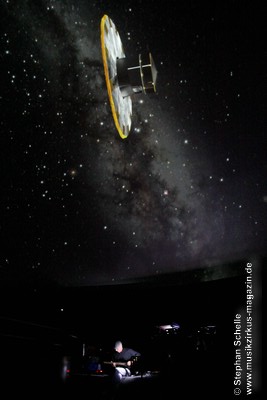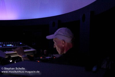 Nach einem Intro startete Frank in das erste Stück „Cry Of The Bell“, das bisher unveröffentlicht ist. Obwohl auch hier zunächst einige Sternenkonstellationen an der Kuppel zu sehen waren, wurde schnell deutlich, dass bei Frank’s Auftritt mehr Animationen wie zum Beispiel Planeten, Kometen oder Satelliten zu sehen sein würden. Das lag sicherlich auch daran, dass seine Musik etwas rhythmischer, melodischer und rockiger angelegt war, als die von Wolfram Spyra. In seinen Stücken waren immer wieder Zitate von Tangerine Dream oder Mike Oldfield herauszuhören.