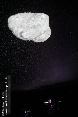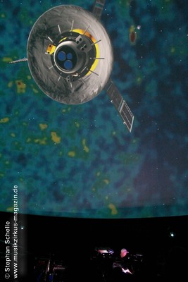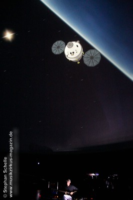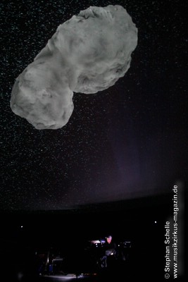 Im Stück „Mandarinentraum“ kamen natürlich einige Klänge und Melodiefolgen sowie Sequenzerparts zum Tragen, die man von Tangerine Dream her kennt, auf die bei diesem Titel angespielt werden soll. Auch das Stück „Outro“, das die Eigenkompositionen in seinem Set beschloss, stammt von „The Journey To Another Place“. Untermalt wurden Frank‘s Stücke durch große Animationen des Saturn, eines eisigen Meteoriten, der langsam über den Köpfen der Besucher dahinzog und durch Satelliten, die teilweise unseren Heimatplaneten umkreisten. Das sah majestätisch aus und passte perfekt zu seiner Musik.