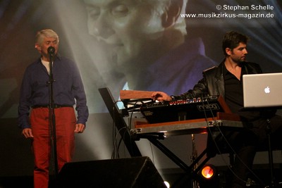 Der zweite Block begann mit leicht perlenden Synthieklängen die mit einem tiefen Bass unterlegt waren. Das wirkte zunächst sehr spacig. Langsam entwickelte sich dieser Part, bis dann erneut ein Rhythmus aufkam und sich ein berauschender Sound entwickelte. Nach einer Weile wechselte Jona dann die Sounds im Synthie, so dass er nun eine Pianolinie spielte, die sich auf einem Synthieteppich auslegte. Das war melancholisch und träumerisch zugleich. Wenige Minuten später betrat dann sein Vater Janosz zum Stück „Warm Sequencing 3“ die Bühne und sang einen eigenen Text in der Sprache der Bergleute aus dem südlichen Polen, der Heimat der Jona’s. Erinnerungen an Klaus Schulze, der in seiner Laufbahn auch oft mit Sängern und Tenören gearbeitet hatte, kamen in dieser Passage auf. Auf der CD ist dieses Stück aber ohne Gesang. Fryderyk war aber der Meinung, dass live Gesang ganz gut dazu passt, womit er Recht hat.