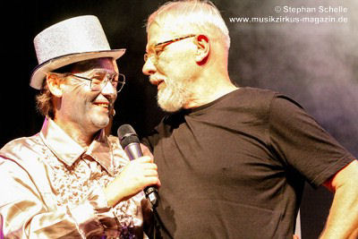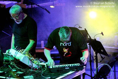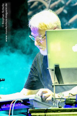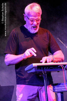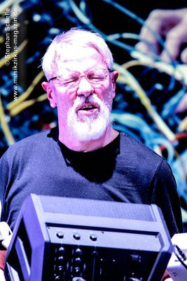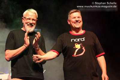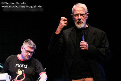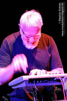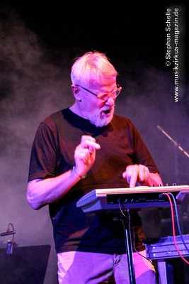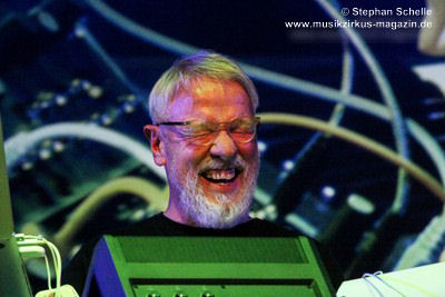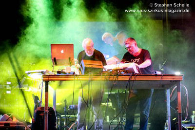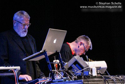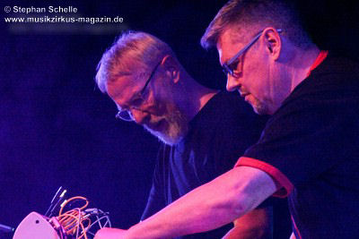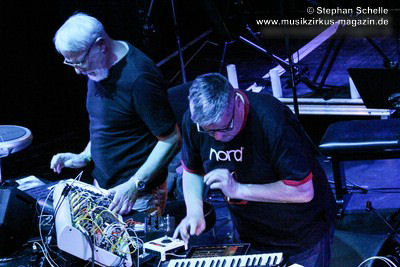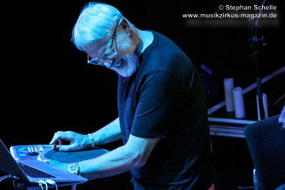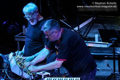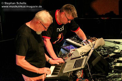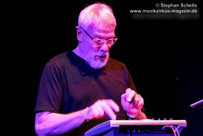 Der 68jährige Musiker trat zusammen mit Andreas Kolinski auf. Die beiden hatten sich einen Tisch mit Laptop und verschiedenen elektronischen Gerätschaften auf die Bühne gestellt. Daran schraubten und drehten sie wie verrückt. Sie hatten sowohl neues Material wie auch einige ältere Stücke dabei, die sie zerlegten und in neuen improvisierten Fassungen darboten. So war denn auch „So weit, so gut“ kaum wiederzuerkennen. Harald und Andreas haben zwar die Sounds der damaligen Instrumente genutzt und doch wirkten sie durch tolle, moderne und hypnotische Rhythmen neu und frisch.
