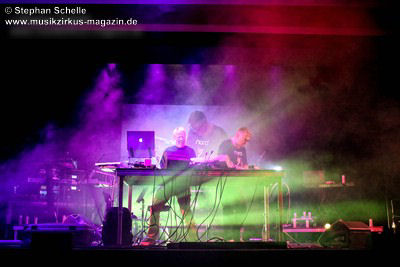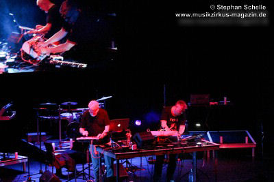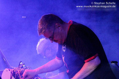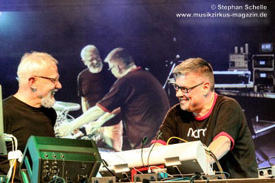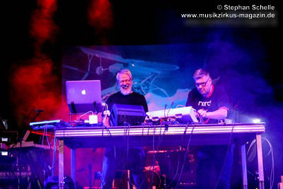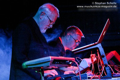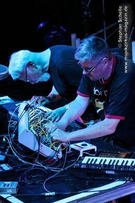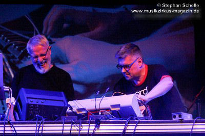 Dann kam das Stück, auf das wohl alle gewartet hatten: „So weit so gut“ vom Debütalbum „Synthesyst“, das lange Zeit die Titelmelodie von Winfrid Trenkler’s Musiksendung „Schwingungen“ war. Doch statt das Stück so zu spielen, wie es der Elektronikfan kennt und im Blut hat, verfremdeten es Harald und Andreas fast bis zur Unkenntlichkeit. Die ersten Rhythmen waren dabei noch klar erkennbar und mit einigen Effekten versehen. Sounds und Melodielinien wurden dann aber nur angedeutet und von der Rhythmusmaschine und den Effekten übertönt. Und doch hatte diese Version etwas Urbanes. Es klang als hätten beide das Stück in seine Einzelteile zerlegt und dann die einzelnen Komponenten zu etwas Neuem wieder zusammengesetzt. Das hatte was Ekstatisches.