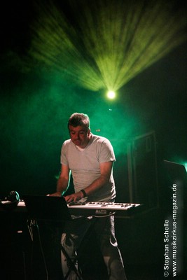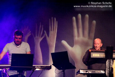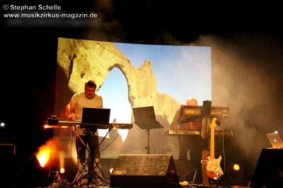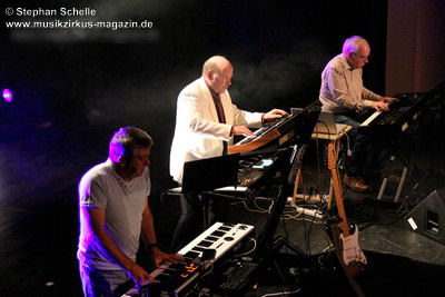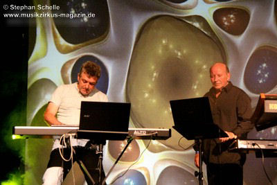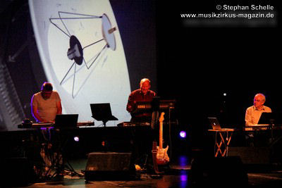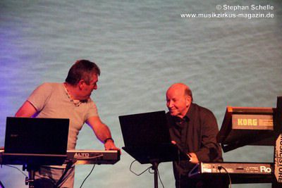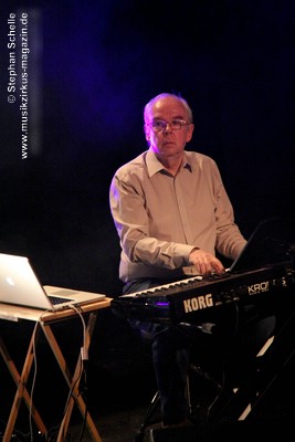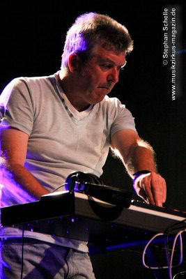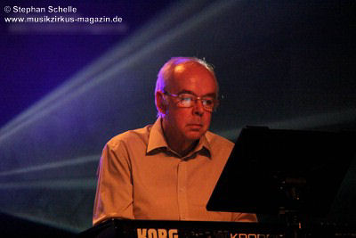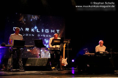 Dann legte erneut John Dyson zusammen mit seinen Mitstreitern los. Für das Stück „Moonwind“ vom gleichnamigen Album kam er an den Bühnenrand und griff zu seiner E-Gitarre. Aus ihr holte er sehr schöne atmosphärische Klänge, und reicherte die elektronischen Soundgemälde seiner beiden Kollegen mit wunderbaren Gitarrenklängen an. Damit verlieh er dem Stück einen leichten Hauch von Progressiver Musik zumal auch ein ums andere Mal eine sanfte Prise David Gilmour hervorkam.