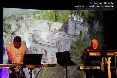 Dem schloss sich dann nahtlos das Stück „Into The Battle“ von Michael Shipway, der auch zu den Elektronikprojekten VoLt und Lamp gehört, an. Auch dieses Stück, das von seinem zweiten Soloalbum „Into Battle“ aus dem Jahr 1994 stammt, ist von rhythmischen Elementen beseelt. Darauf legte er eine eingängige Melodie. Man konnte deutlich erkennen dass die drei Musiker stilistisch nicht weit auseinander liegen und ihre Tracks und Spielweise perfekt zusammen passen. Leider hatte Michael, dessen Stück auf Schlachten der frühen Weltgeschichte beruht, dieses mit Bilden von computeranimierten Panzerschlachten in einer Wüstenlandschaft bildhaft unterlegt. Für meinen Geschmack war das für die heutige angespannte Lage in der Welt nicht wirklich geeignet, konnte die Faszination dieses wunderbaren Stückes aber nicht schmälern.