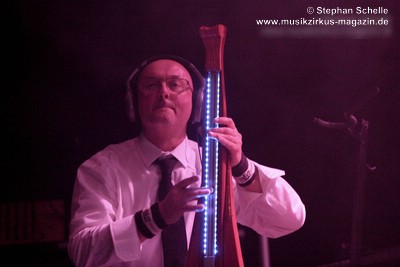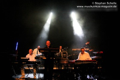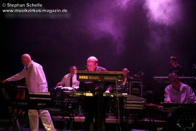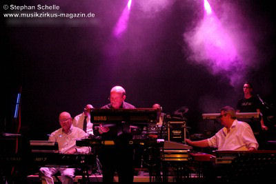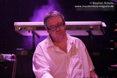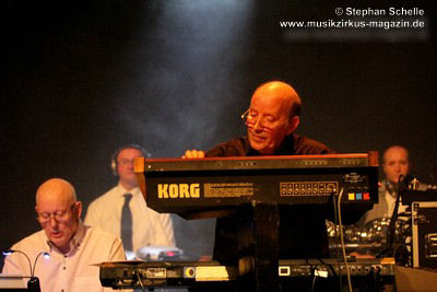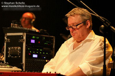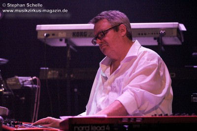 Daran schloss sich mit „Aurora Choralis“ ein Stück an, bei dem sich die anderen Musiker zurücknahmen und John Kerr die Bühne überließen. Dieses hymnisch, klassisch, sakrale Stück ließ die Zuschauer für einen Moment inne halten und tief in den Musikkosmos von John Kerr eintauchen. Zu Beginn von „Oceans Of Commotions“ wechselte John dann zunächst wieder an den Flügel, um das Stück effektvoll einzuleiten. Er spielte die Melodie zunächst Solo an diesem Instrument und zeigte hier seine musikalische Klasse. Nach gut zwei Minuten führten dann die bekannten Wellengeräusche und Keyboardsounds in den Kern des Stückes über, während John wieder hinter seinem Keyboard Platz nahm. Der Track entwickelte sich durch Schlagzeug und E-Gitarre dann zu einem rockigen Stück, bei dem John an den Keyboards ein wenig unterging, was bei mir gemischte Gefühle auslöste. Zum Einen mag ich die rockige Variante der Elektronikmusik, zum Anderen hätte ich beim vielleicht letzten Auftritt von John Kerr gerne mehr von seinem Spiel gehört.