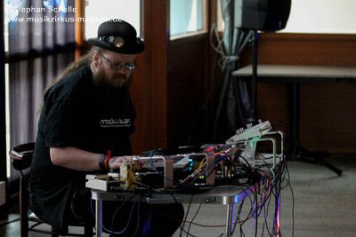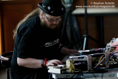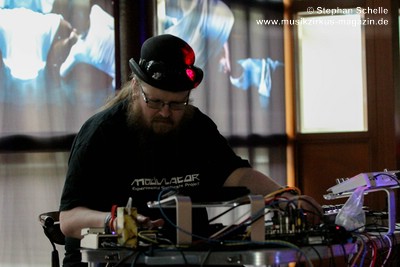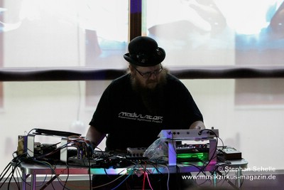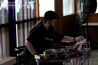 Im oberen Saal spielte zu Beginn und zwischen den Konzerten Jez Creek, der auch als Modulator ESP firmiert. ESP steht dabei für „Experimental Synthesis Project“. Der aus dem britischen Nottingham stammende Musiker spielte dort seine Sets Solo. Hier einige Fotos: