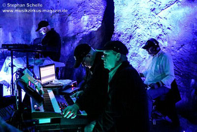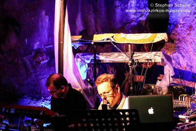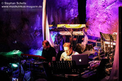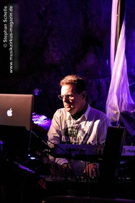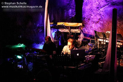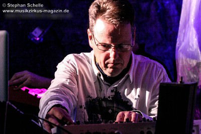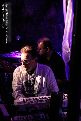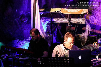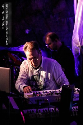Als letzter Act des Tages war dann das aus Leverkusen stammende Duo Pyramid Peak an der Reihe. Axel Stupplich und Andreas Morsch hatten für den Gig neues Material zusammengestellt. Die beiden boten besten Elektronikstoff. Da Axel und Andreas aber mit ihrem Instrumentarium auf dem Boden und nicht auf der Bühne platziert waren - aus Platzgründen war ein anderer Aufbau nicht möglich - konnte man die Beiden leider nicht von allen Plätzen aus sehen.