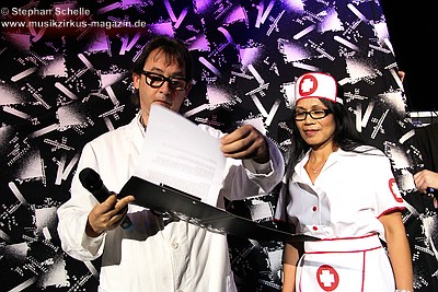 Moderator Frank sich in einen Arztkittel gekleidet und ließ sich von