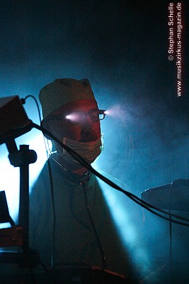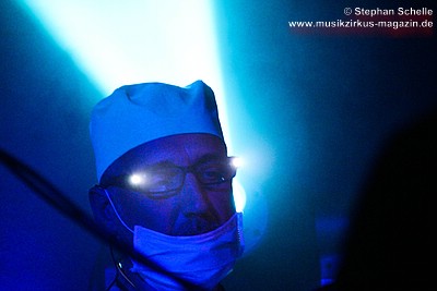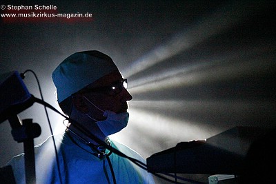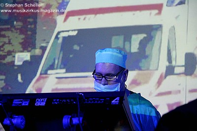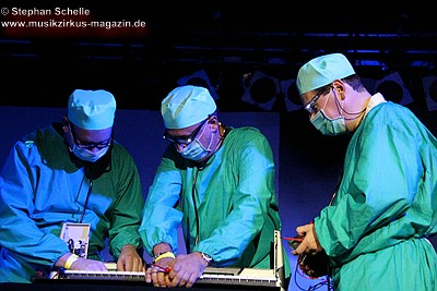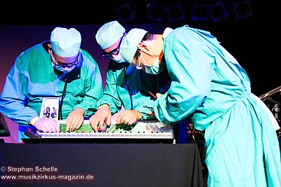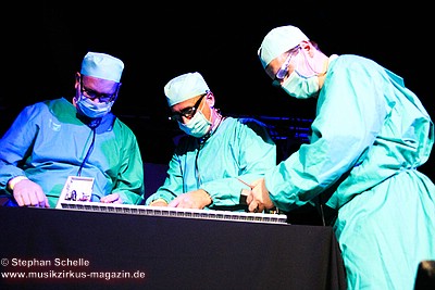 zeigt die drei Musiker in OP-Bekleidung. Dieses Outfit hatten sie sich