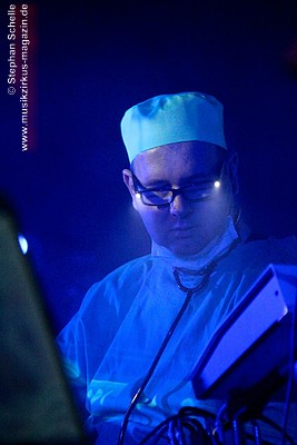 Andreas, die in ihrem OP-Outfit um eine Keyboardtastatur standen und