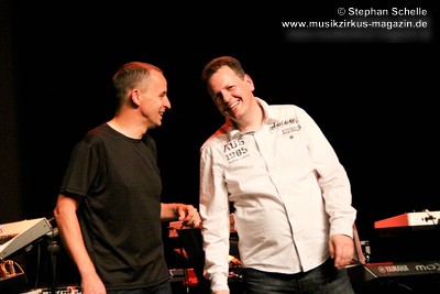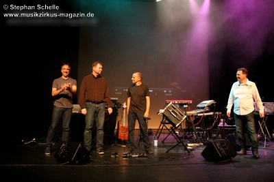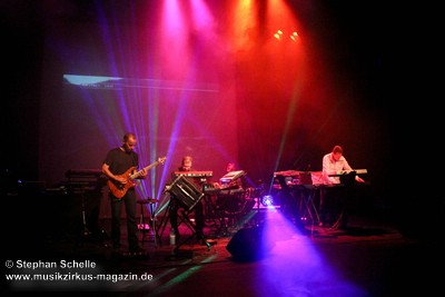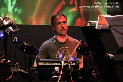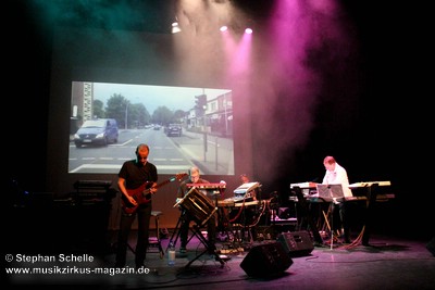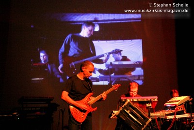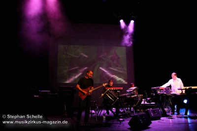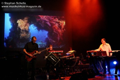 Mit „Dive“ vom Album „Ocean Drive“ hatten sie dann einen Klassiker (für mich eines der schönsten Stücke von Pyramid Peak) im Programm, der erstmals mit Gitarre live gespielt wurde. Der eingängige und mitreißende Track gewann durch Max‘ Gitarre um Einiges. Max ging dabei aber – wie beim gesamten Konzert – recht behutsam mit seinem Instrument um. Auch der Rhythmus, eine Kombination aus dem Rechner und dem Schlagzeugspiel von Uwe Denzer war knackiger als im Original gespielt. Dieses Mal waren im Hintergrund wunderbare Unterwasseraufnahmen zu sehen.