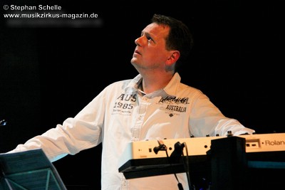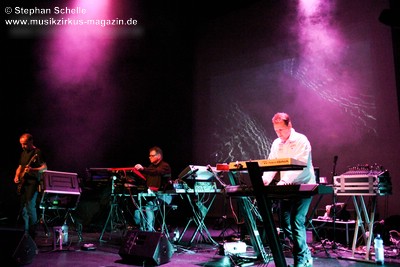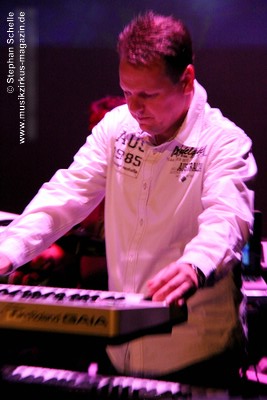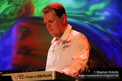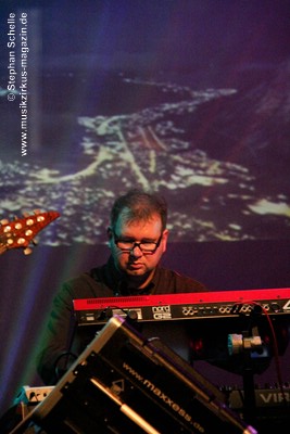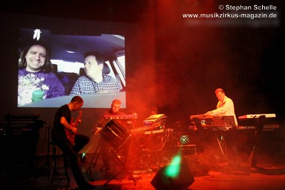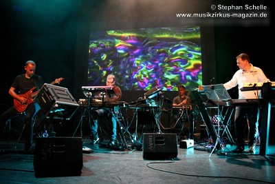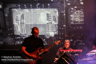 Und wieder ging es atmosphärisch und spacig weiter. Dieses mal mit dem neuen Stück „Stratosphere“. Dazu wurde ein Film von Testpiloten gezeigt, der schon etwas antiquiert zu sein schien bzw. auf alt getrimmt war. Schwebende Flächen trafen in diesem Stück auf pulsierende Sequenzer und leicht rockig angehauchte Gitarrenmotive. Dem folgte dann mit „Injection“ wieder ein Stück der aktuellen Pyramid Peak-CD „Anatomy“. Sehr schöne Farbspiele bestimmten auf der Leinwand und der Bühne das optische Bild.