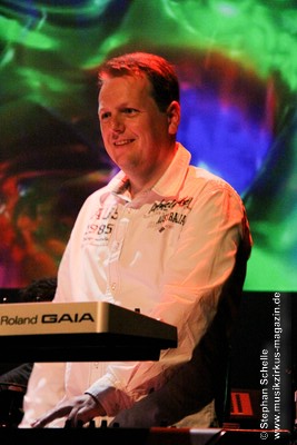 Die Jungs begannen mit einem ganz neuen Stück, das so neu ist, das es noch keinen Namen trägt. Die vier, das sind Axel „Axess“ Stupplich, Uwe Denzer und Andreas Morsch sowie Max „Maxxess“ Schiefele, starteten mit dem Opener recht sphärisch in ihren Gig. Auch Max, der ansonsten für eine recht rockige Gitarre gut ist, steuerte eher sphärische Gitarrenklänge bei, die im weiteren Verlauf dann aber recht moderate rockige Ausmaße annahmen. Die Keyboardsounds schwebten so ein bisschen durch den Raum und erinnerten damit auch ein wenig an die „Berliner Schule“. Doch schnell schälte sich eine Rhythmussequenz heraus, die deutlich die Handschrift von Pyramid Peak trug. Mit fortlaufender Dauer nahm das Stück an Dynamik zu und Maxxess durfte dann zum Ende hin doch noch mal ein wenig das Tempo anziehen, in dem er ein sehr schönes Solo einbaute. Ein klasse Einstieg in den Gig.