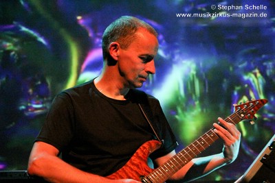 Als zweiten Track hatten sie mit „Dark Energy“ ein Stück vom aktuellen Album „Anatomy“ im Programm. Auch dieses Stück begann recht sphärisch während Maxxess einige sehr proggige Gitarrenmotive in die Musik einbrachte. Seine Gitarre tat den Stücken sichtlich gut. Wie Ron es vor dem Konzert schon bemerkte, ist Max‘ Gitarre die „Kirsche auf der Torte“ oder wie wir sagen würden, „Das Salz in der Suppe“ bei den Stücken von Pyramid Peak. Als optische Untermalung hatten sie ein Video mit Computeranimationen einer fremden Welt an die Leinwand projiziert, das die Musik perfekt unterstützte.