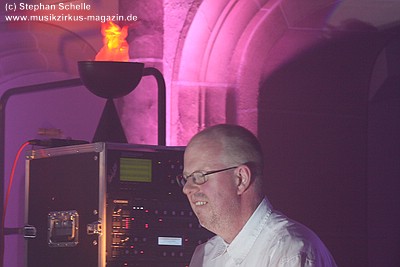 an seinen Tastaturen und spielte eine etwas sakral anmutende Melodie.