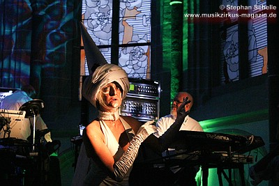 vor die Bühne. Dieses Mal hatte sie einen spitzen Hut auf dem Kopf, so