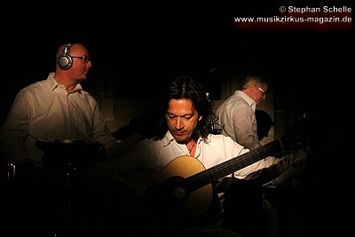 Violinenmotive, während Raughi den Körper seiner Akustikgitarre als