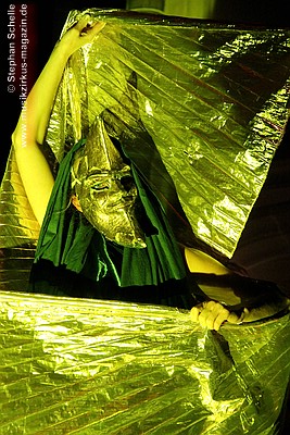 Stück in ein goldenes Flies gehüllt, das flügelartig wirkte. Dazu trug sie