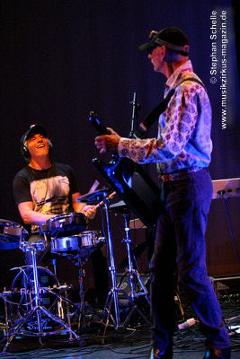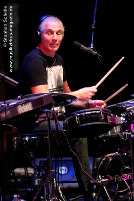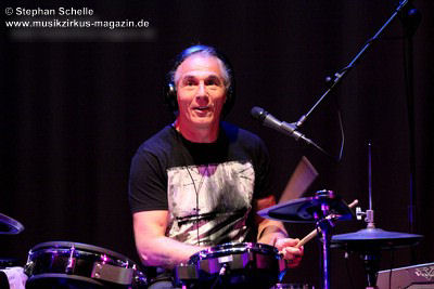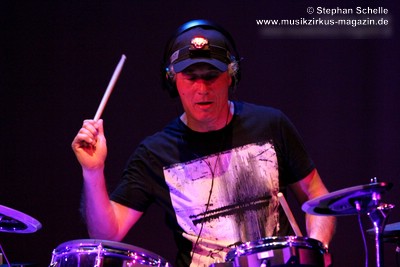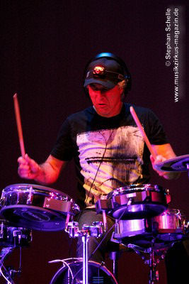 Das folgende „Optical Illusion“ startete mit einem treibenden Beat und herrlichen Synthiesounds, die als Intro in diesen Pop angehauchten Track führten. Bei diesem Stück kam dann erstmals Gesang auf. Ein sehr schönes Stück, das neben druckvollem Schlagzeug, zarten Violinenpassagen vor allem durch seine eingängige Melodie bestach, die einige klassische Motive enthielt. Das Stück „On The Web Again“ hatte einige Sounds und Klangfolgen die an Vangelis‘ Album „Albedo 0.39“ erinnerten. Das Stück war aber keine Hommage an den Griechen, sondern wechselte nach einigen Momenten in einen leicht jazzigen Teil, bei dem Dominique durch eine Sololinie glänzte. Im Mittelteil hatte dann Marc Hazon die Chance sich mit einem klasse Schlagzeugsolo zu präsentieren bis die Sequenzer wieder mit einstiegen und sich eine Art Konversation zwischen Schlagwerk und Synthie entwickelte. Das war druckvoll und rockig zugleich und Marc Hazon konnte sein Können eindrucksvoll unter Beweis stellen.