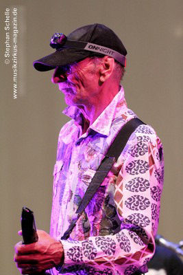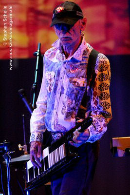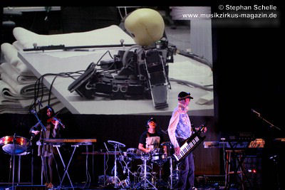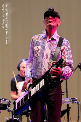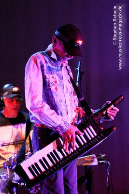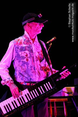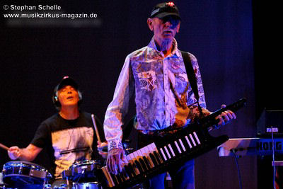 An das Drumsolo schloss sich dann nahtlos mit „Onyx“ der größte Hit von Space Art an, der die Band in den 70’er Jahren bekannt machte. Auch heute klingt dieses Stück noch frisch und eingängig. Hier zeigt sich auch die Nähe zu dem anderen großen Act der 70’er, nämlich zu Space, die mit „Magic Fly“ einen Riesenhit hatten. Dominique wechselte während des Stückes erstmals an sein tragbares Keyboard, um sich damit auf der Bühne frei zu bewegen. Sehr lustig waren die Zeichentrickanimationen, die während dieses Stückes auf der Leinwand gezeigt wurden. Auch das folgende „Speedway“, ebenfalls aus den 70’ern, schlug in dieselbe Kerbe, denn die eingängige Melodie hatte wieder einiges an Popappeal.