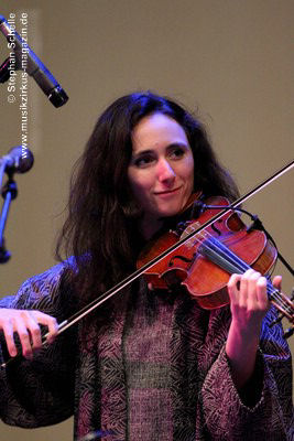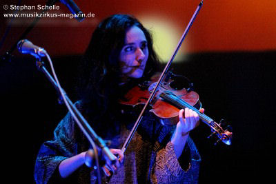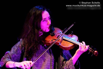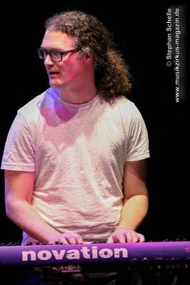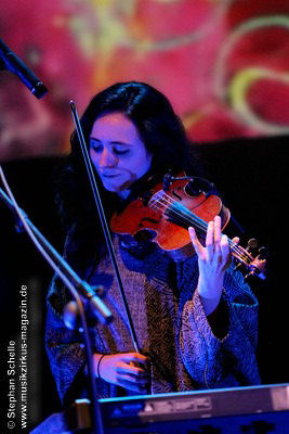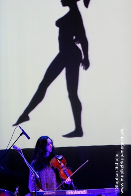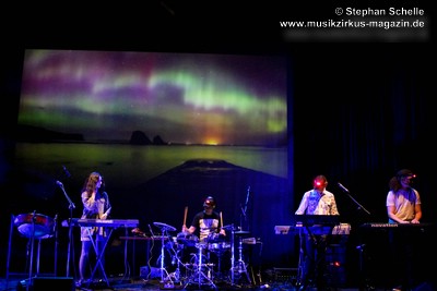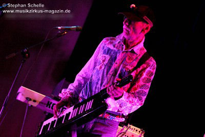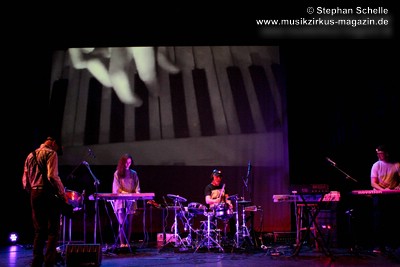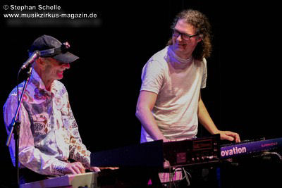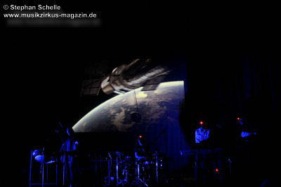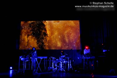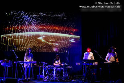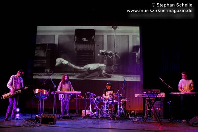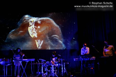 Space Art steht für einen leicht Pop angehauchten Elektroniksound, der eine gewisse französische Leichtigkeit mit sich bringt und durch aus auch mal jazzige Elemente in die Musik integriert. Gestartet wurde mit dem Stück „L'Obsession d'Archibald“, das mit pulsierenden Synthierhythmen begann. Die Melodie des Stückes und die sich wiederholenden Rhythmen stellten auch gleich die Blaupause für den Sound von Space Art dar, der eine ganz eigene Faszination ausmacht. In diesem Stück kamen sowohl elektronische Musik wie auch Artrockelemente zum Tragen. Die Vier agierten sehr gut zusammen und machten aus dem Stück eine Art Space-/Artrocknummer mit treibendem Groove. Die besondere Note bekam das Stück durch Lilli’s Violinenspiel. Sehr gut passte auch das druckvolle Schlagzeugspiel von Marc Hazon ins Gesamtbild. Auf der rückwärtigen Leinwand zogen derweilen Bilder aus dem All mit leichten Verfremdungen dahin.