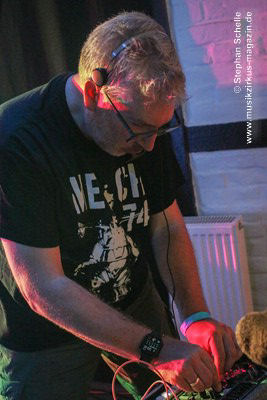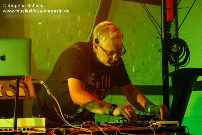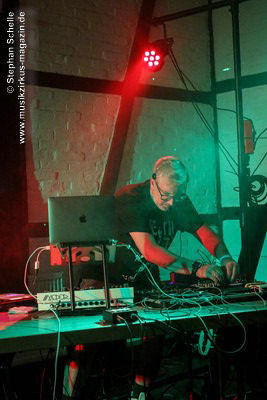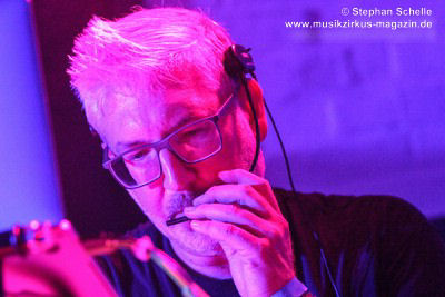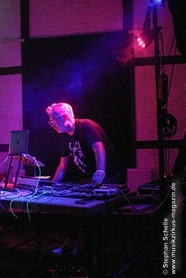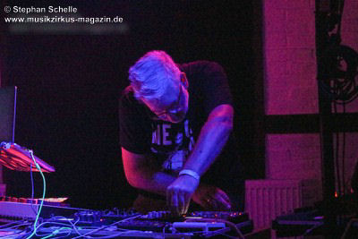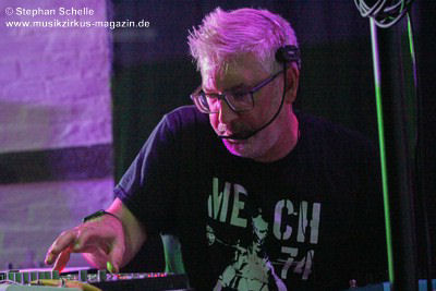 In Vorbereitung auf seinen Auftritt beim Electronic Circus hatte er dann seine Soundarchive durchforstet und stieß auf die Dateien für das China-Konzert. Die Programmierten Parts von „Niemand lacht rückwärts“ (Liveversionen sind auf den Alben „Sauce Hollandaise“ (1998) und „@shra“ (2002) erschienen) nutzte Steve um darauf zu improvisieren. Steve begann zunächst wieder recht spacig, das änderte sich aber nach gut einer Minute Dieser hypnotische Track mit seinen typischen Ashra-Sounds/Beats stellte dann auch den Höhepunkt seines Sets dar. Das sorgte dann für Begeisterung im Publikum, auch wenn Steve allein nicht den Druck und die Dynamik entfalten konnte, wie es die vierer Formation aus Göttsching, Grosskopf, Ulbrich und Baltes aufs Parket legten. Harald Grosskopf, der ebenfalls zur damaligen Ashra-Formation gehörte und bei diesem Konzert in der ersten Reihe saß, war ebenfalls sehr bewegt von diesem Track. Nach dem Konzert umarmten sich beide, die an diesem Abend 50% von Ashra ausmachten. Es war eine Reise in die Vergangenheit mit Sounds im Hier und Jetzt, denn Steve verstand es die Loops für sich zu vereinnahmen und daraus etwas grandioses Eigenes zu machen. Steves Soloauftritt war eine hypnotische Reise, die von Beginn an bis zum letzten Ton fesselte.