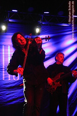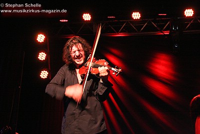 Nach dieser aufwühlenden Nummer war dann mit „Unter dem Flüsterbogen“ eine Ruhepause angesagt. Bei diesem balladesken Stück verließ Mani die Bühne und mischte sich Geige spielend unter das Publikum. Das gab dem Ganzen eine besondere Note. Beim abschließenden „Finale“ zogen sie dann noch mal alle Register und Ulli und Joschi lieferten sich in einem wahren Feuerwerk ein Duell an ihren Saiteninstrumenten. Dabei mischten sie mal eben eine kurze Passage des Manfred Mann-Klassiker’s „Davy’s On The Road Again“ in den Titel. Nach gut zwei Stunden war der offizielle Teil des Konzertes beendet.