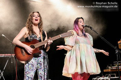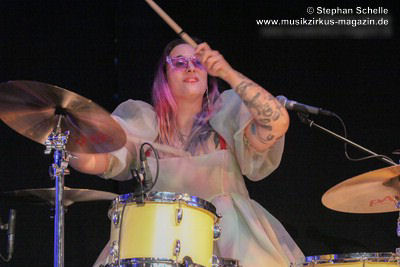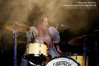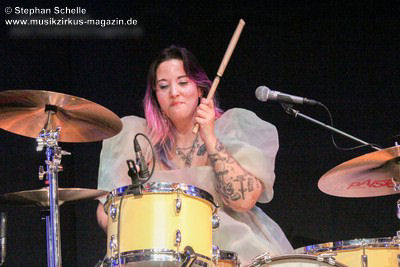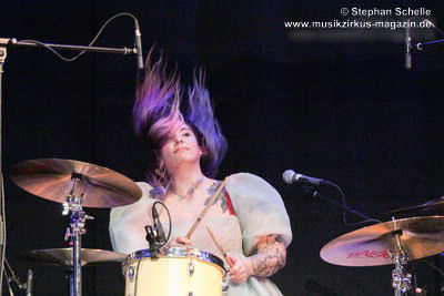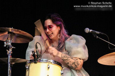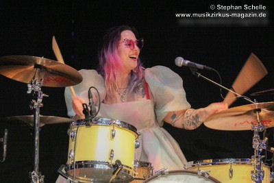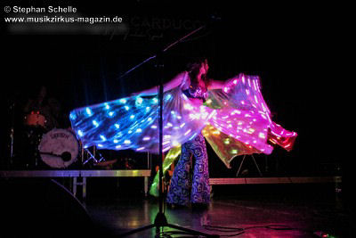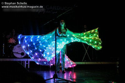 Bei „The Angel“ hatte dann Mary Reynaud ihren großen Auftritt. In der abgedunkelten Halle sang sie das Lied in einem aus unzähligen LEDs bestehenden, weißen Umhang. Diesen bewegte sie zunächst wie Flügel und tanzte dann, den Umhang schwingend über die Bühne. Das war eine sehr beeindruckende Performance. Danach glänzte Léa Fernandez mit einem grandiosen Schlagzeugsolo, bei dem sie nicht nur sehr harmonisch und druckvoll spielte, sondern auch das Publikum fest in ihrer Hand hatte.