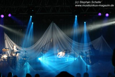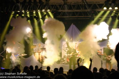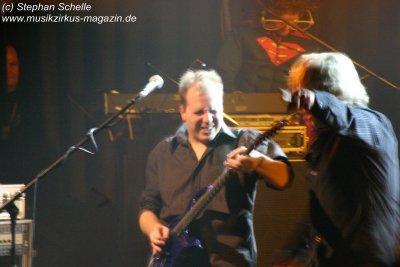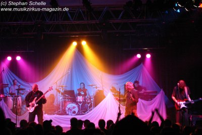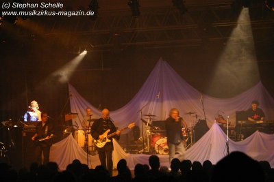 Ganz vorn standen die nochmals verbesserten Showelemente. Das Licht hatte Stefan Danielak jun. noch einmal neu programmiert, was sich wirklich gelohnt hat, denn die Lichteffekte, verbunden mit dem Nebeleinsatz waren atemberaubend und hypnotisierten die Zuschauer. Musikalisch hatten sie auch etwas Hand an einigen Stellen angelegt, denn zum einen klangen die Stücke und die Soli perfekter (nicht steril sondern noch sauberer gespielt), vor allem Tattvas Einlagen waren bisher die besten der Tour, zum anderen hat die Band das Stück „Komm und tanz“ umarrangiert. Das Stück, mit dem sie den zweiten Teil der Konzerte beginnen, klang rockiger und direkter. Das lag vor allem daran, dass die Keyboardpassagen etwas entschlackt wurden und, wie ich finde, der Bass von Milla noch druckvoller und ausgeprägter rüber kam. Auch „Solar Music“ spielten sie an diesem Abend sehr rockig. Ich hatte das Gefühl, als sei vor allem der Dialog der beiden Schlagwerker Rolf Möller und Demian Hache noch druckvoller und lebendiger gewesen.