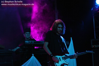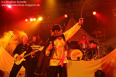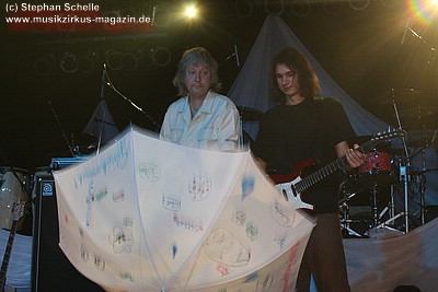 Der zweite Teil begann – wie immer – mit „Komm und tanz“, mit dem Grobschnitt dann nahtlos an den ersten Teil der Show anknüpfte. Bei „The Sniffer“ war Harro wieder in der Rolle des Schnüfflers auf der Bühne unterwegs, bevor dann das Stück, das in keiner Show fehlen darf und auf das alle warten, gespielt wurde. „Solar Music“ in der „Sonnentanz“-Version wurde an diesem Abend noch ekstatischer und ausführlicher gespielt als es bisher der Fall war. Die Soli waren wieder unglaublich. So hatte Nuki wieder andere Passagen parat, Milla mischte mal eben kurz eine Tonfolge und ein „la, la, lah“ aus der „Symphony“ in sein Solo und die Rhythmusgruppe Rolf Möller und Demian Hache spielten sich förmlich in einen Rausch. Allein diese Tatsache machte aus dem „Sonnentanz“ ein Erlebnis.