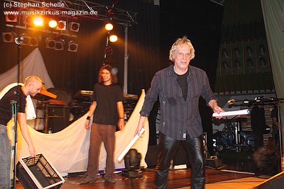 Während dem anschließenden „Merry Green“ machte sich in der Halle ein Geruch von Benzin breit. Hatte man sich vor Konzertbeginn noch über die vielen Feuerwehrmänner, die die Bühne inspizierten, lustig gemacht, kam jetzt ein etwas merkwürdiges Gefühl auf. „Sollte da etwas Ungewöhnliches passiert sein? Was ist, wenn die Jungs jetzt wieder einen pyrotechnischen Effekt zünden?“ dachte ich so bei mir. Doch dann war schnell klar, der Geruch hatte mit der nächsten Showeinlage zu tun, denn zum ersten Mal ließ sich Toni auf einem Motorroller (eine Hommage an seinen selbst gebastelten Shopper aus den 80’ern) zum Stück „Space Rider“ auf die Bühne fahren. Zu diesem Stück ließen sie dann auch noch Konfetti von der Decke regnen. Zu „Powerplay“ wurden dann alle vorgestellt, auch die Mädels und Jungs hinter der Bühne. Mit dem neuen Stück „Another Journey“, das seit dem 2008’er Auftritt in Betzdorf zum festen Programmteil gehört, und bei dem Axel „Felix“ Harlos (er wirkte neben Eroc als zweiter Schlagzeuger auf dem ersten Grobschnitt-Album mit) die Band an den Perkussion unterstützte, endete der dreieinhalbstündige Marathon mit kleinen Geschenken (Poster wurden ins Publikum geworfen) an die Fans.