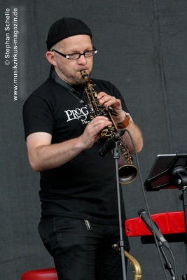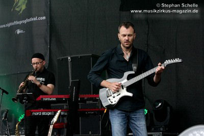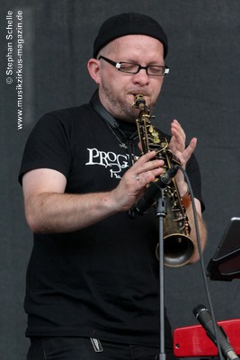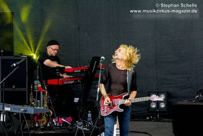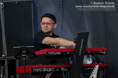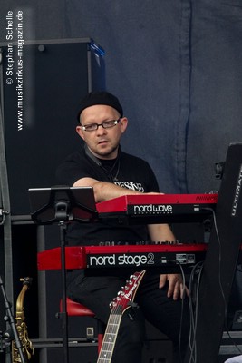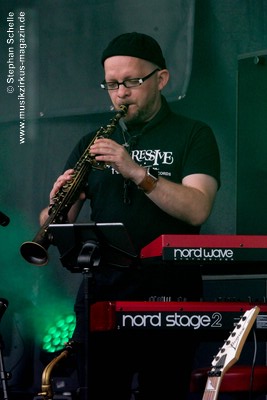 Arnold (Keyboards, Saxophon) auf der Bühne. Gerald Nahrgang ist unter