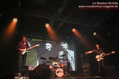 Musiker im Heute und Jetzt auf der Bühne zu sehen, während die Leinwand