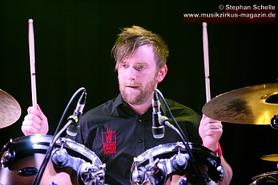 Mit dem Stück „Little Cascade“ kam dann auch noch eine Spur Worldmusic mit in das Set, denn der Rhythmus hatte schon etwas orientalisches und verlieh dem Ganzen eine hypnotische Note. Wer sich jetzt immer noch nicht von der Band angesprochen fühlte, der muss wohl taub gewesen sein. Apropos Rhythmus: Die Rhythmusgruppe aus Schlagzeuger und Perkussionist gefiel mir ausgesprochen gut, denn sie sorgten für einen fetten Sound, wenn sie zusammen agierten. Im ersten Teil kam Paul Jennings mit einem Cajun an den Bühnenrand, auf dem er einen unglaublich fetten Rhythmus hinzauberte.