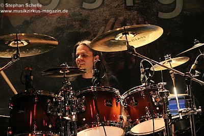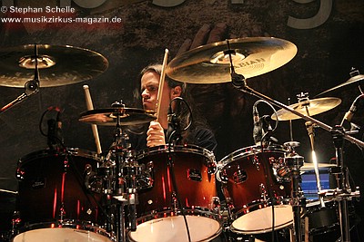 Batdorf hinter den Schlagfellen. Mit ihm ist ein weiterer Musiker von