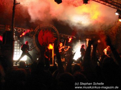 | Den heißesten Auftritt des Abends hatten zweifelsohne Subway To Sally. Und das ist im wahrsten Sinne des Wortes zu verstehen, denn die sieben Potsdamer legten eine Show hin, die mit pyrotechnischen Einlagen nur so gespickt war. Neben Songs der aktuellen Scheibe waren auch ältere Stücke im Programm. So durfte natürlich der Veitstanz nicht fehlen, zu dem die brodelnde Menge wild tanzte. Auch die Henkersbraut, Mephisto, Die Schlacht, Sag dem Teufel und Kleid aus Rosen standen auf dem Programm.