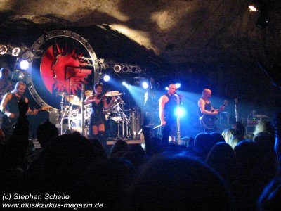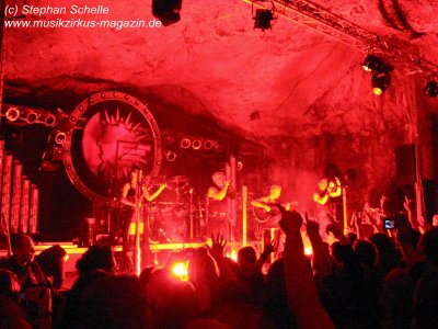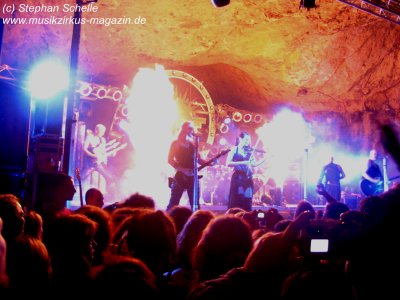 Neben einer sehr ausgereiften Lightshow waren vor allem die Feuerspielereien ein absoluter Hingucker. Ob nun gleich zu Beginn Feuerfontänen am Rand der Bühne für einen Knalleffekt sorgten oder aber bei Die Schlacht aus der Feuerorgel im Hintergrund die Funken sprühten, alles passte perfekt zu diesem durchgestylten Auftritt. Dann wurde Feuer gespuckt und der krönende Höhepunkt kam als sich Bodenski und Simon mit Flammenwerfern bewaffneten. Mit diesen schossen die beiden Feuerfontänen über die Köpfe der Zuschauer. Da wurde es in den vorderen Reihen ganz schön warm. Die Musik von Subway To Sally war im Vergleich zu den bisher aufgetretenen Bands rauer, härter und brachialer. Die hauten da Sachen raus, dass ich hoffte, meine wenigen, noch festgewachsenen Haare nicht zu verlieren. Die Band brachte die Höhle dermaßen zum beben, dass man glaubte, die wollten mit der Musik und der Pyrotechnik einen weiteren Gang in den Stein sprengen.