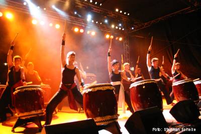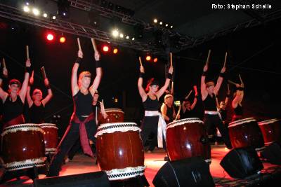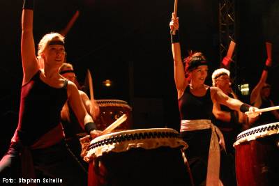 Männern und acht Frauen auf, die die Kunst des japanischen Trommelns Taiko